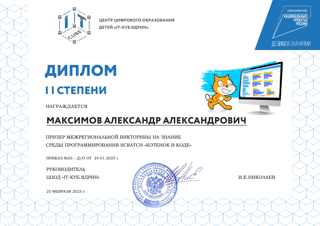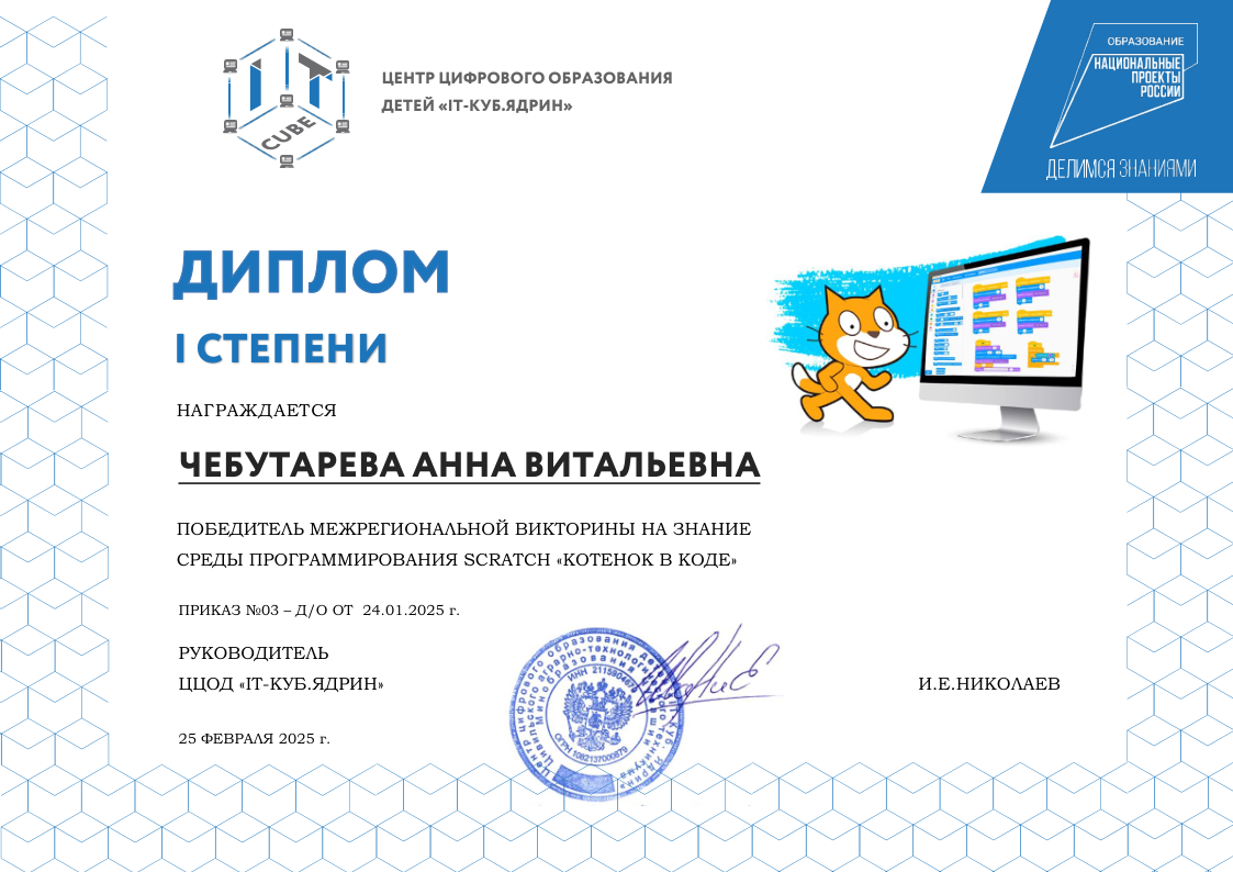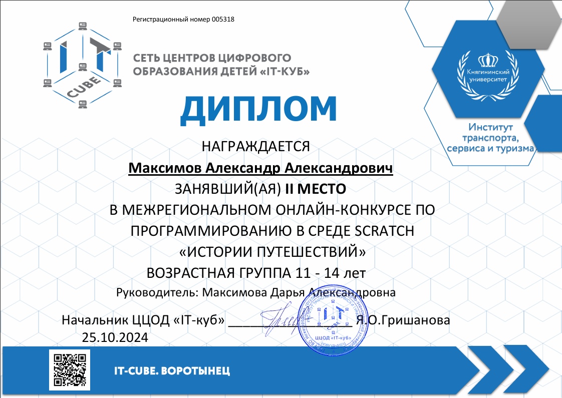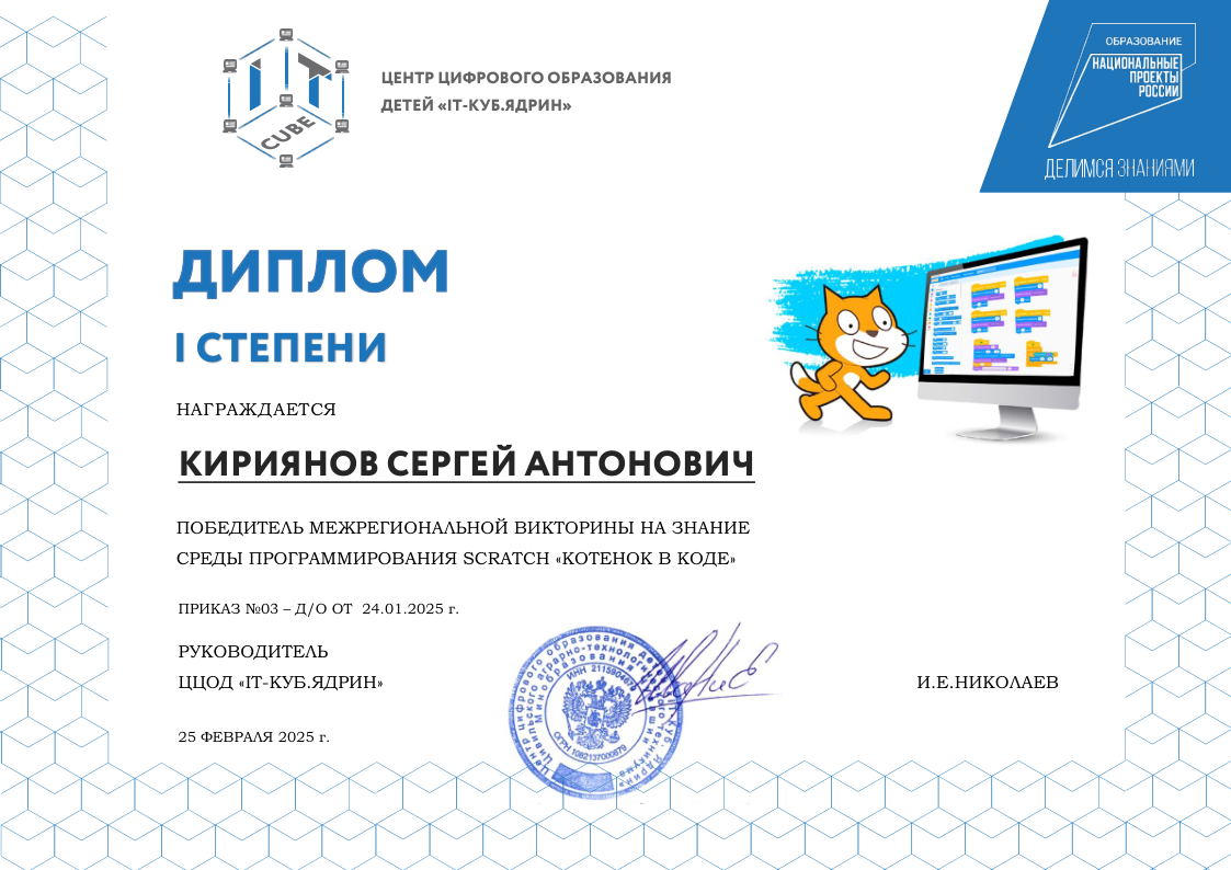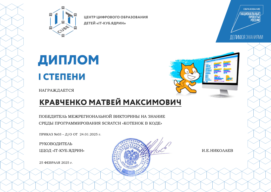 Краткое описание программы — «Основы алгоритмики и логики» направлена на формирование у учащихся алгоритмического мышления и базовых навыков программирования. В ходе обучения участники осваивают принципы построения алгоритмов (линейных, разветвляющихся и циклических), учатся формализовывать задачи и создавать проекты в среде Scratch. Программа развивает логическое и системное мышление, умение планировать деятельность и доводить решение от идеи до работающего результата, создавая основу для дальнейшего изучения языков программирования высокого уровня.